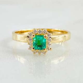 Anillo Solitario Cojin Cuadriculado | 24pts Diamantes 12pts Esmeralda Oro Amarillo | 2.75gr | T7